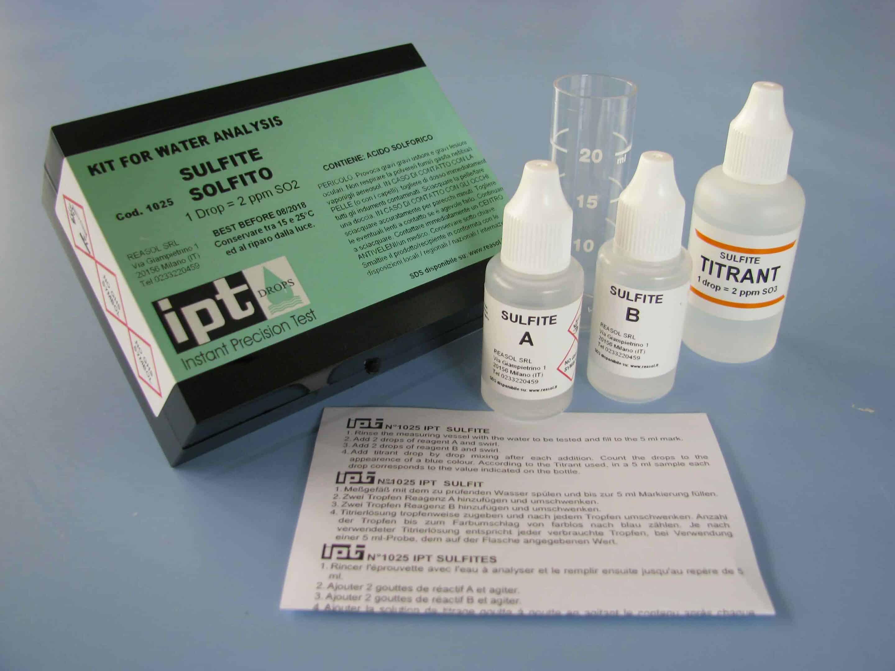 Spare Parts and Accessories | - In the IPT sulfites 2 ppm kit (code 1025), each drop of titrant employed on 5 ml of sample corresponds to 2 ppm SO3. When relatively high concentrations of sulfite need to be detected, the IPT sulfites 10 ppm kit (code 1025.1) can be used, in which each drop of titrant employed on 5 ml of sample corresponds to 10 ppm SO3. |
