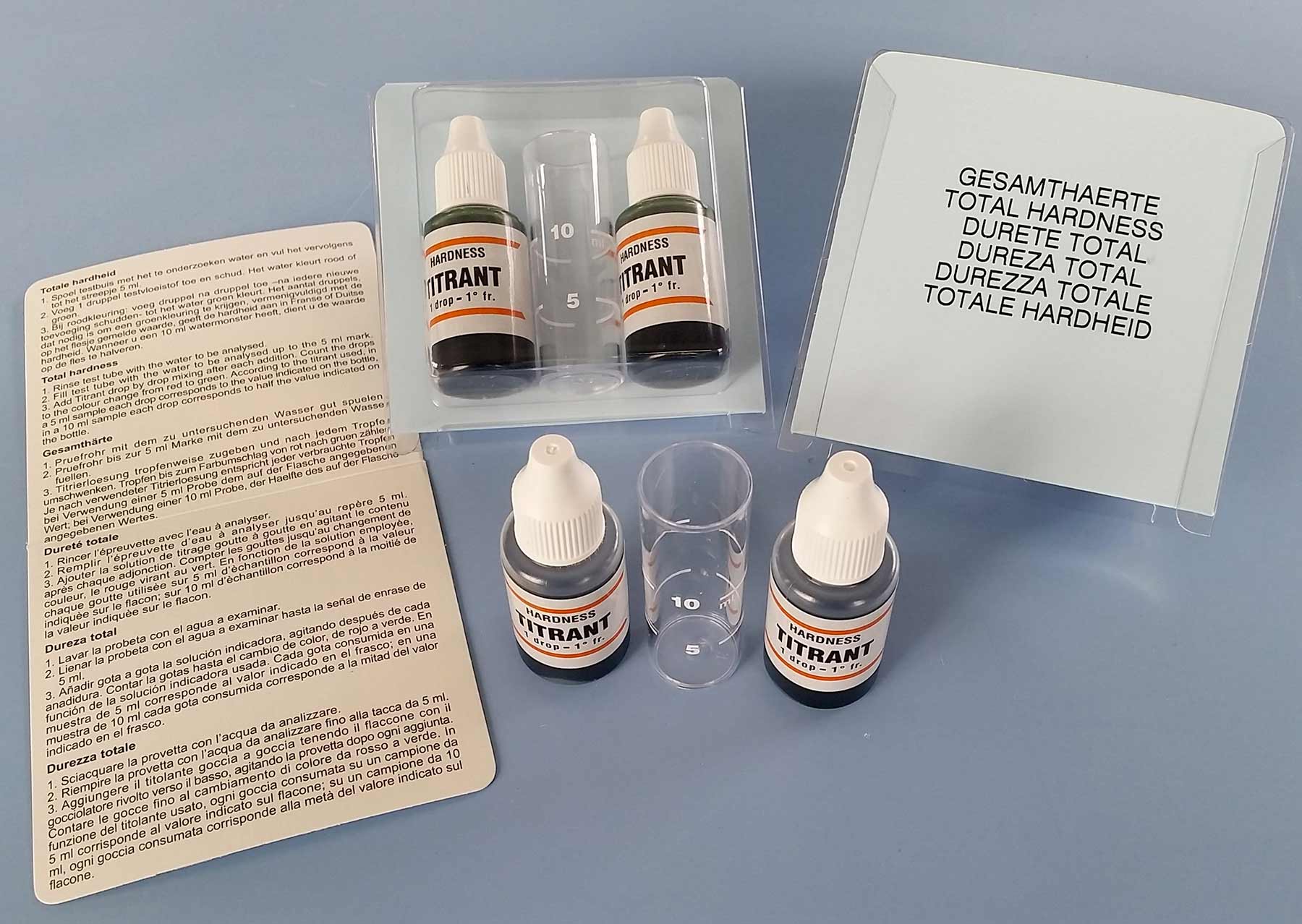 Kit Contents | • 2 bottles 15ml titrant/indicator hardness |